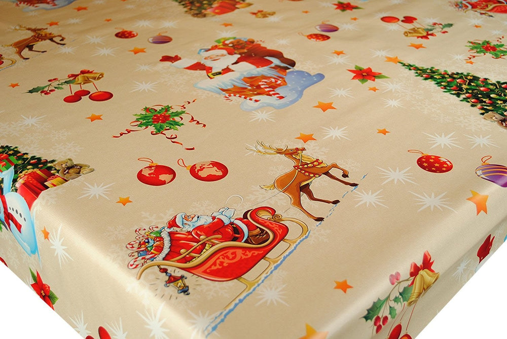 Santa Sleigh on Natural by Karina Home 137cm Round Wipe Clean Tablecloth
